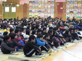 1年生は、感謝の気持ちを書き込んだ「金銀のメダル」を作りました。今日の朝の時間に、そのメダルを6年生に贈りました。6年生は、そのメダルを首にかけ、送る会に臨みました。