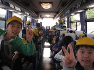 バスでの移動中、係が中心になってレクレーションをしています。座席から動くことはできないのですが、結構楽しくやっています。